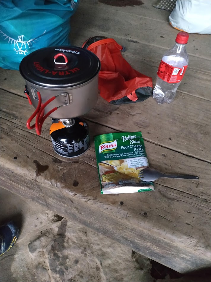 Wir bekommen noch einen guten Platz im Shelter und müssen nicht zelten. Unter dem Vordach gibt es dann auch das erste richtige „Trailmahl“. Tag 1, und ich schaffe es direkt mein Essen anbrennen zu lassen. 😀
