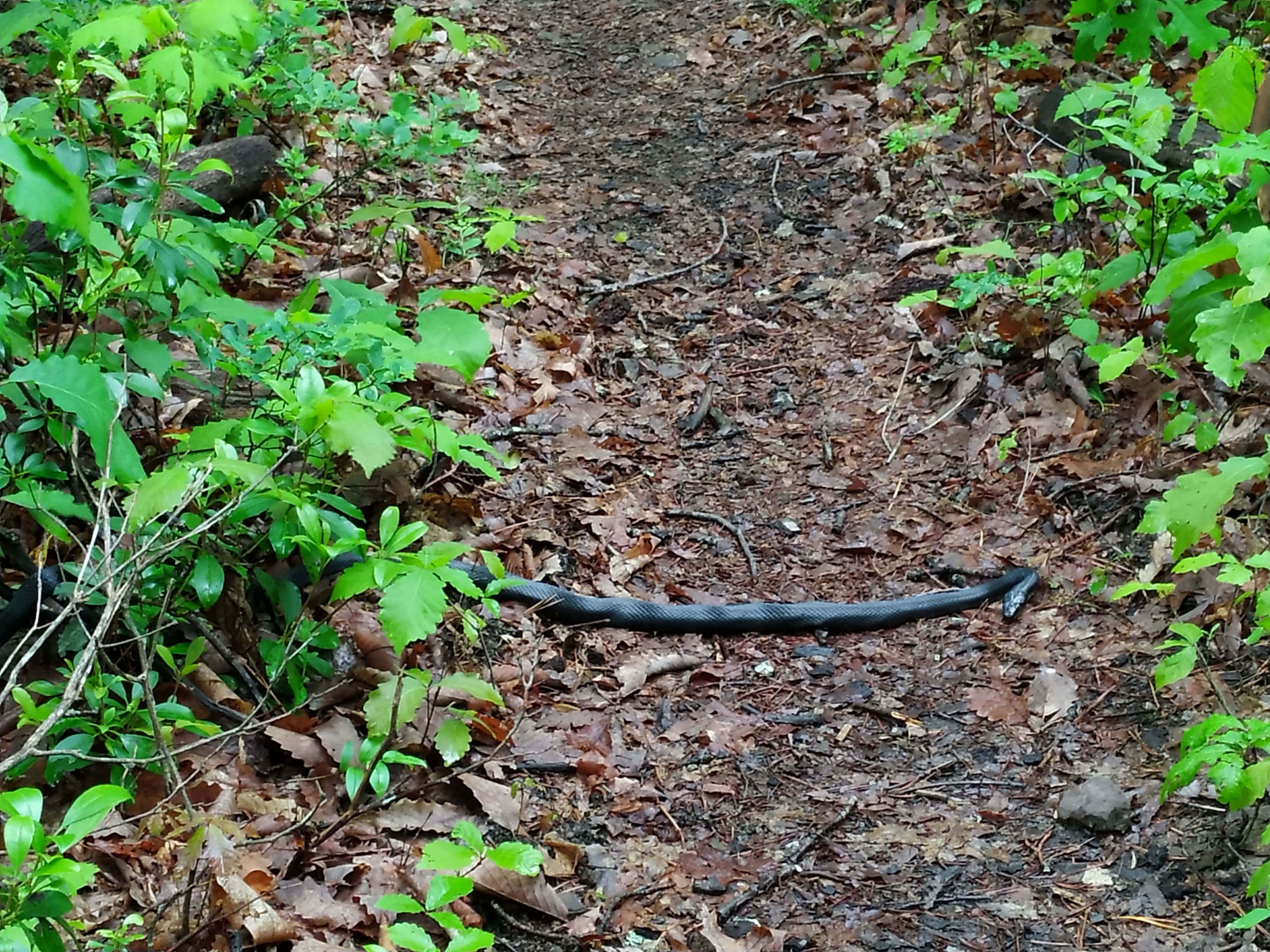 Allerdings kam es dann so, wie es ja irgendwann Mal kommen musste. Und es war ja klar das es ausgerechnet an dem Tag passiert, an dem ich auf weiter Flur ganz alleine unterwegs bin: eine Schlange! Und diesmal keine Kleine! Ich war so flott unterwegs, das ich fast über sie weg gesprintet wäre. Allerdings war Ihr wohl kalt, da sie sich kein Stück gerührt hat. Also bin ich todesmutig näher ran, habe ein Foto geschossen und sie danach weiträumig durch das Grün neben dem Trail umlaufen. Die ganze Zeit über mit der Gewissheit, dass da auch noch andere lauern konnten.