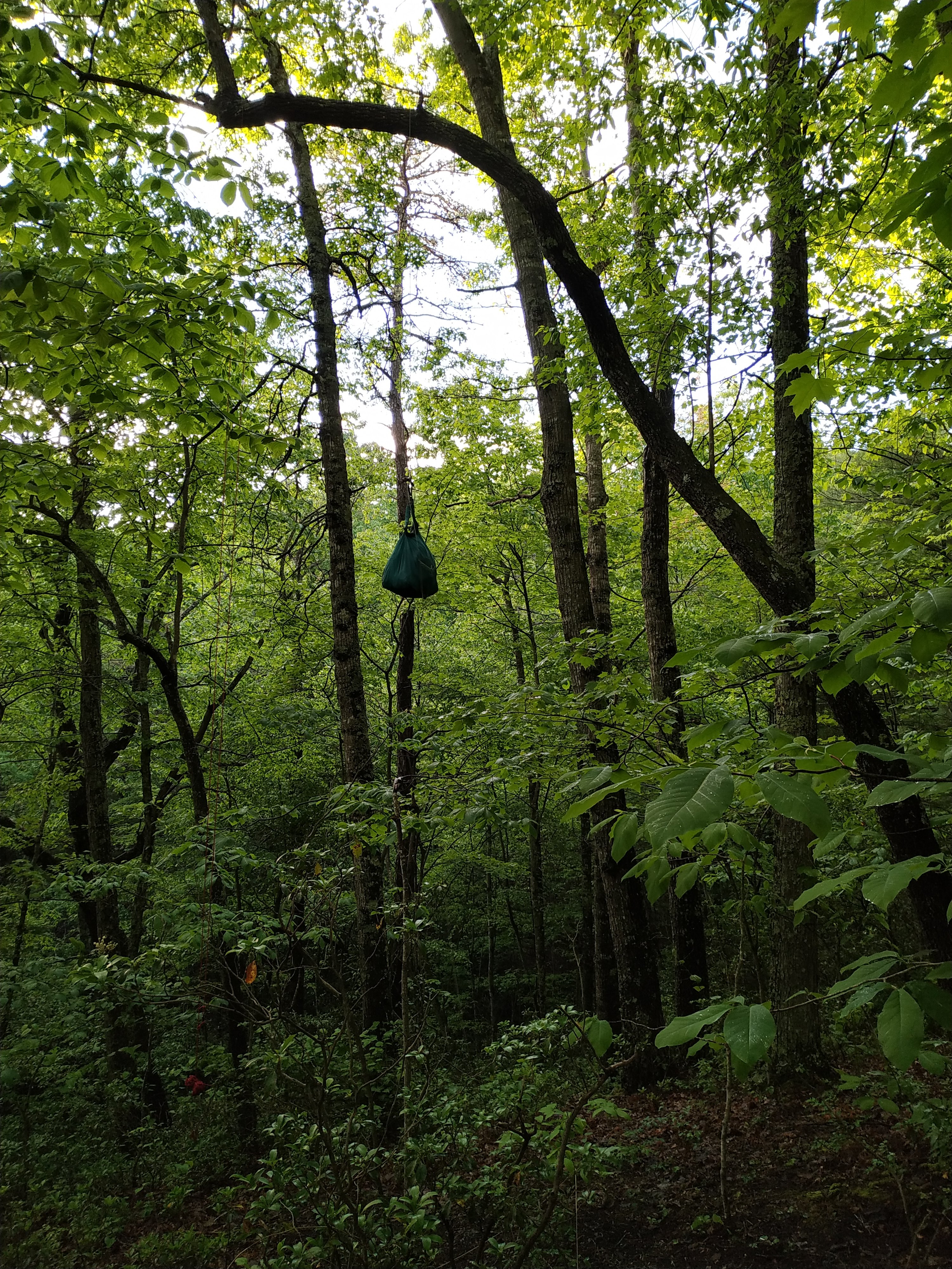 Und auf besonderen Wunsch hin hier noch ein Foto von meinem Bear hang, also der Art, wie ich mein Essen nachts sichere. Das ist eigentlich Recht einfach. Zuerst wird ein Stein an das eine Ende eines Seils geknotet und über einen Ast geworfen. Anschließend wird der Stein entfernt und das Seil am Karabiner des Essenssacks befestigt. Dann wird das andere Seilende durch den Karabiner geführt und der Sack wird ganz bis zum Ast hochgezogen. Dann knüpft man über Kopfhöhe eine Schlinge, steckt einen Stock hindurch und lässt den Sack wieder runter. Das ist dann die Mäuse und Bären sichere PCT-Methode. Dabei achtet man darauf, dass der Foodbag ausreichend weit weg vom Stamm ist und keine andere Äste in der Nähe sind. Und der Baum selbst selbstverständlich weit genug vom eigenen Nachtlager ist.