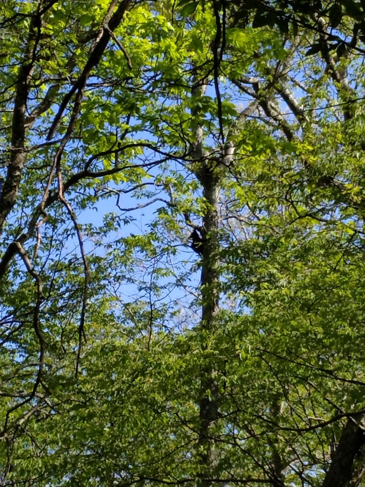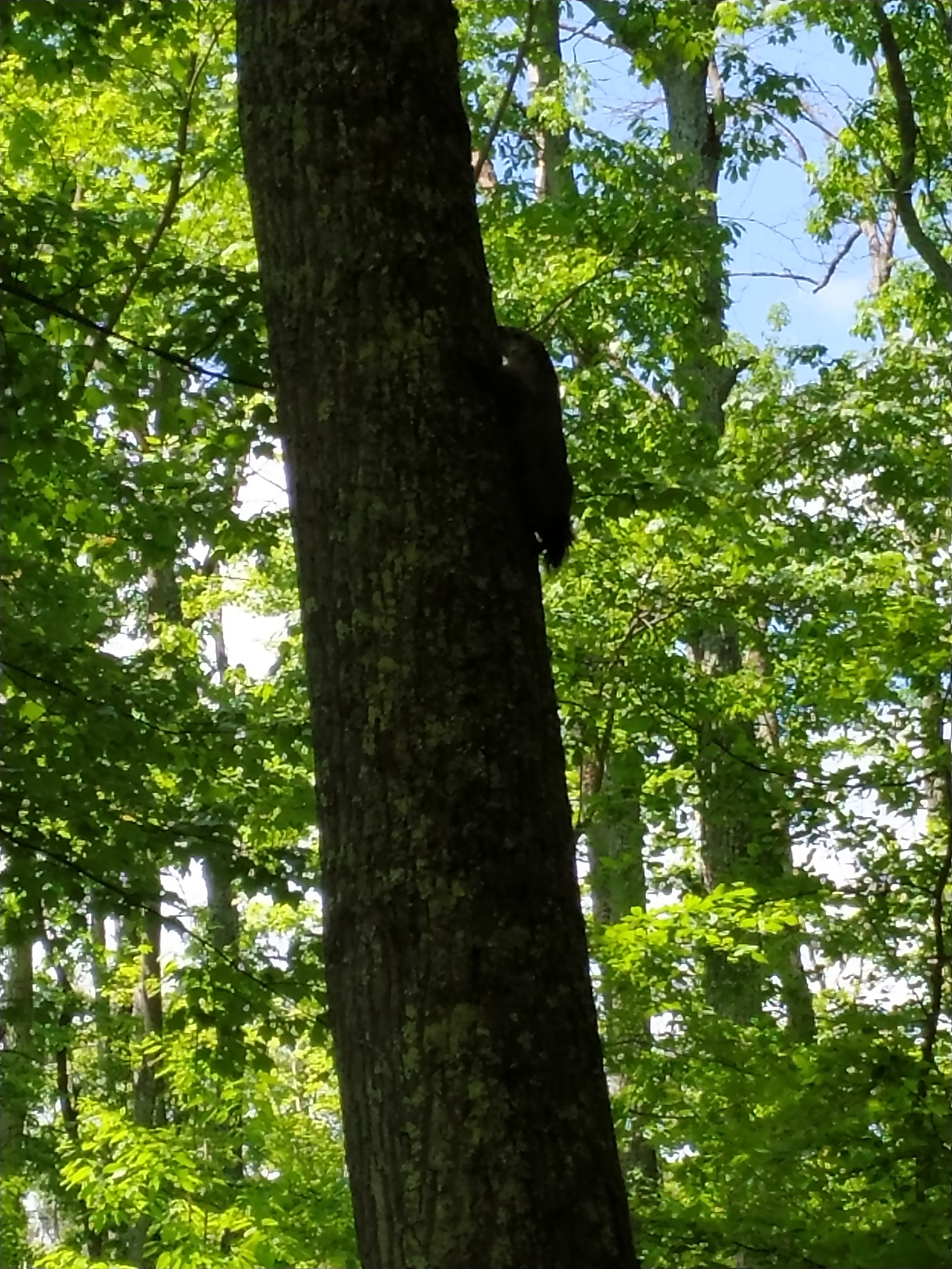 Aber wie schon gesagt: heute meinte der Trail es gut mit mir. Gerade als der Tag anfing sich richtig zu ziehen (über 20 Meilen nach10:00h sind kein Spaß) und mein Schienenbein schlimmer wurde, hörte ich etwas im Unterholz knacken. Und tatsächlich: zwei Jungbären kletterten einen Baum hoch und runter. Und die beiden waren durchaus fotogen. Mama Bär hat übrigens unter dem Baum gewartet. Auf den Fotos ist das leider nicht gut zu erkennen. Aber die Kleinen können klettern! Die sind den Baumstamm quasi hoch gelaufen, als sie mich gehört haben.