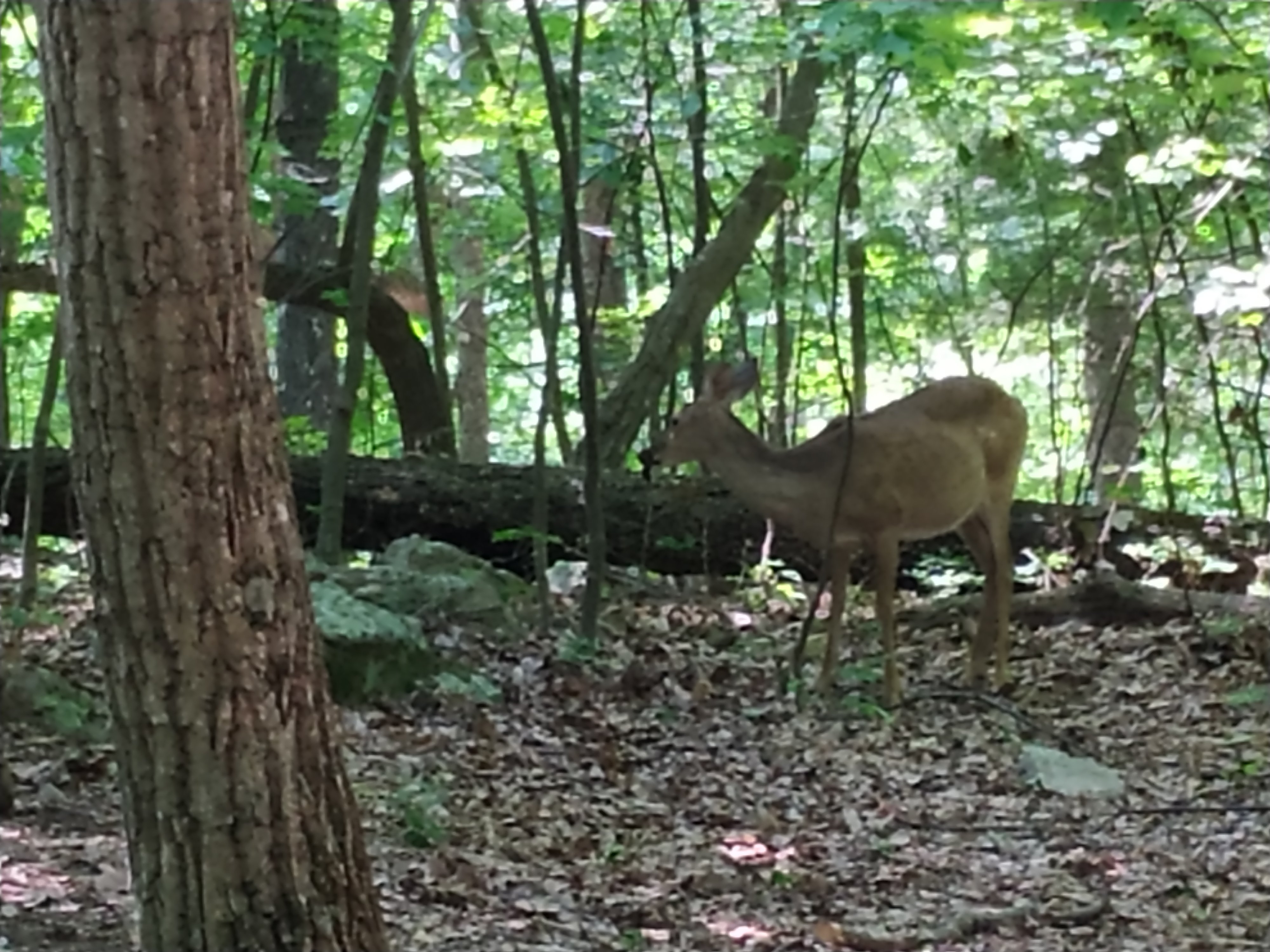Und während ich am Cove Mountain Shelter meine zweite Frühstückspause mache, raschelt es auf einmal im Unterholz und ich bekomme Besuch. Und das Reh lässt sich von mir auch nicht wirklich stören.