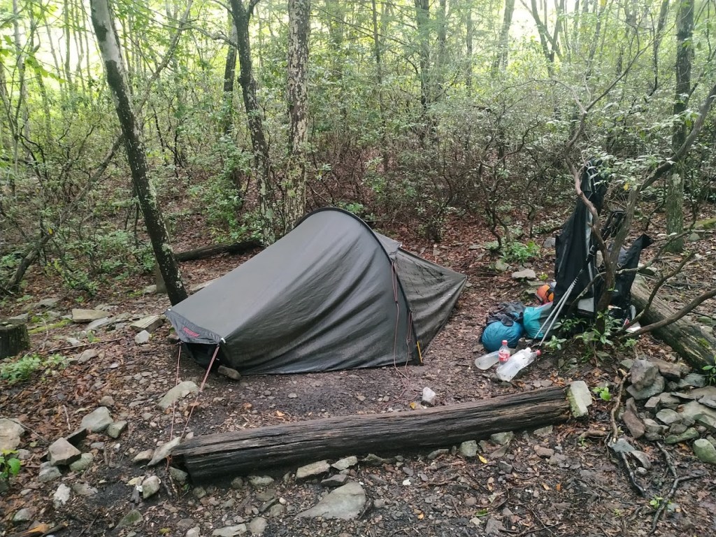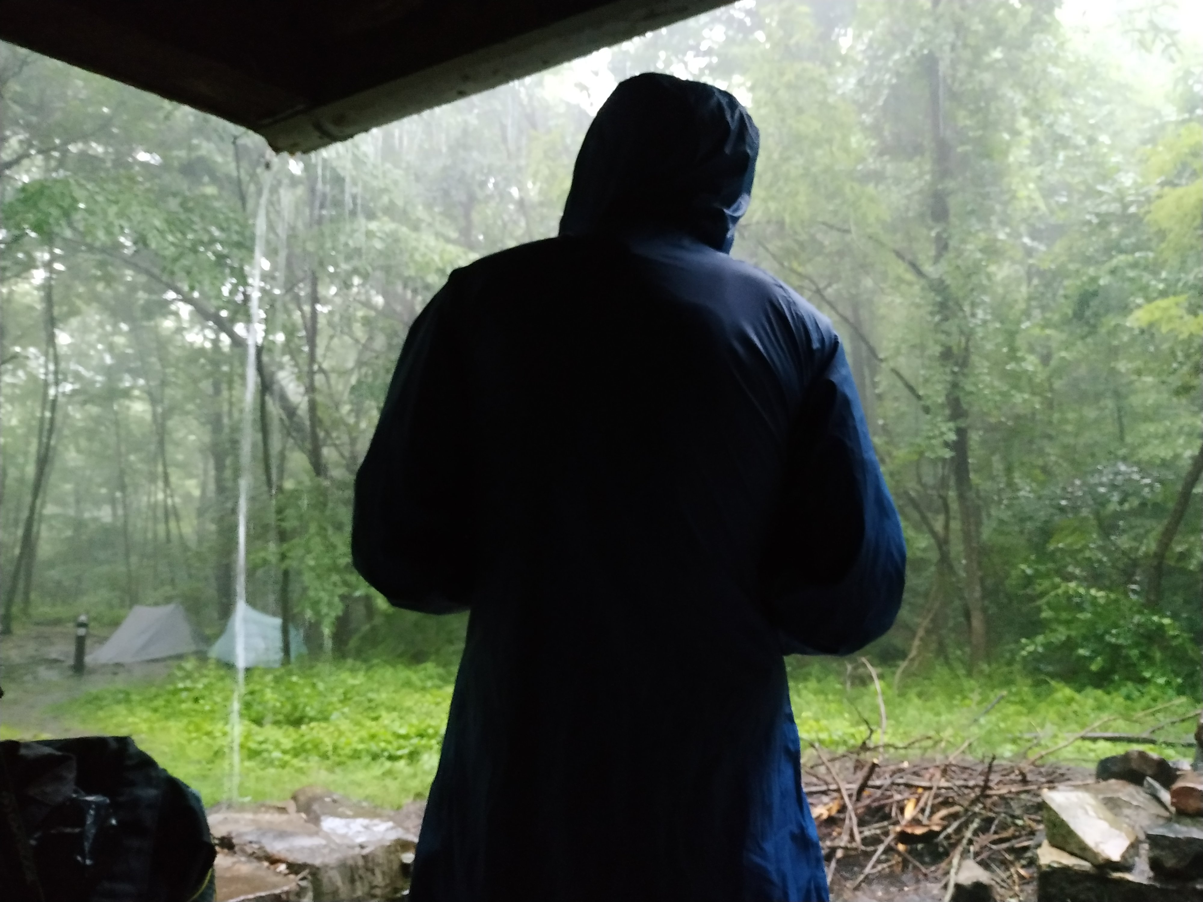 Aber für eine Nacht wird das schon gehen. Nachdem ich schnell mein Zelt aufgebaut und Wasser geholt habe, habe ich am Shelter mein Abendessen gekocht. Und da kam der zweite Regenguss des Tages. Wunderschön mit Blitz und Donner gewürzt.
