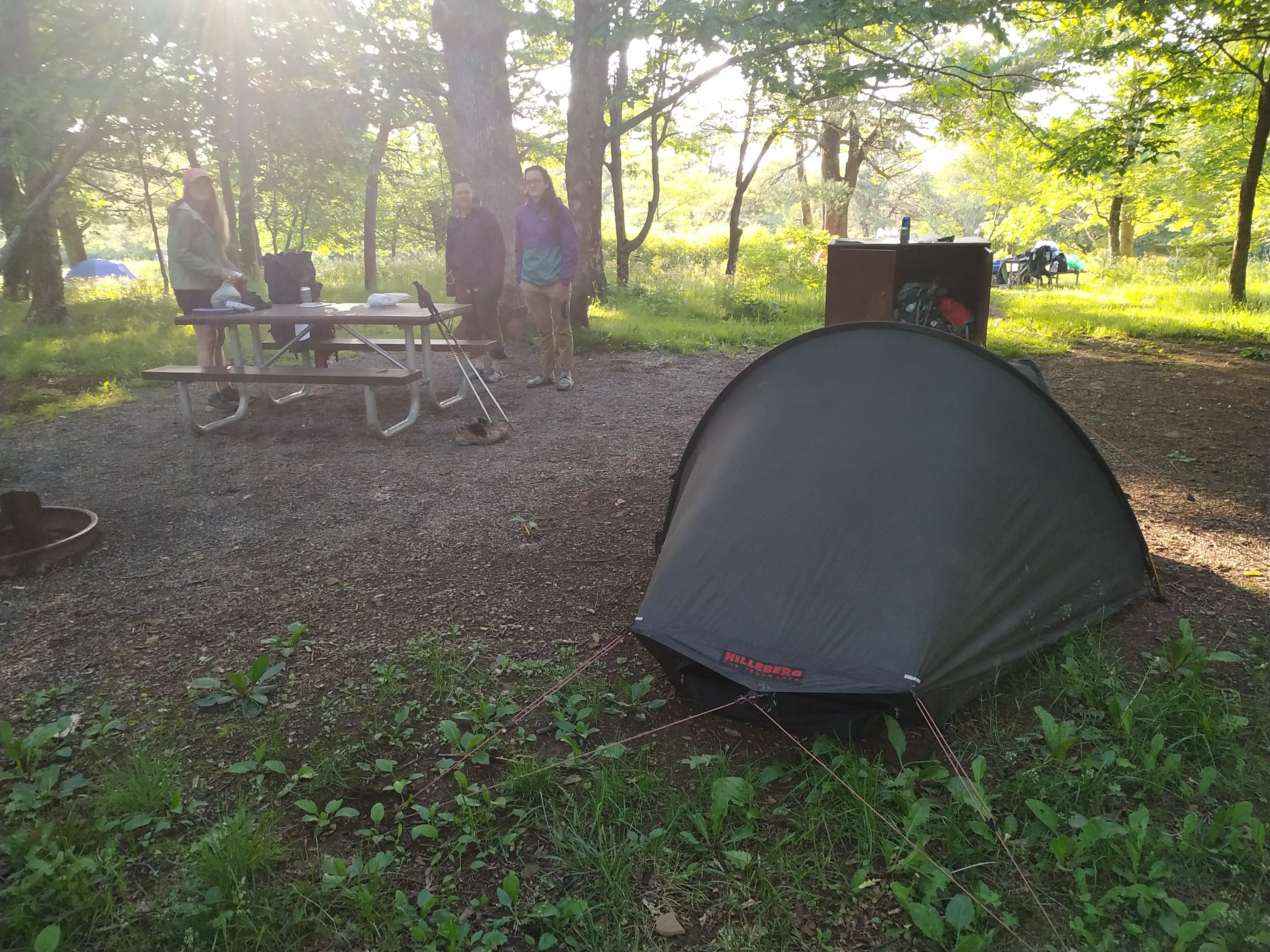 Danach habe ich mir mit Two Fingers, Pretzel, Gaby und Dellz einen Zeltplatz geteilt, den Gaby und Dellz gemietet hatten. Den Abend haben wir mit Geschichten und Witze erzählen verbracht. Und vielleicht haben wir auch ein Bier oder zwei dabei getrunken. 😉 Unser Essen haben wir vorher habe noch in der bärensicheren Box deponiert. Auf dem Weg zum Zeltplatz haben wir nämlich auf dem dem Gelände des Campgrounds einen Bären gesehen!