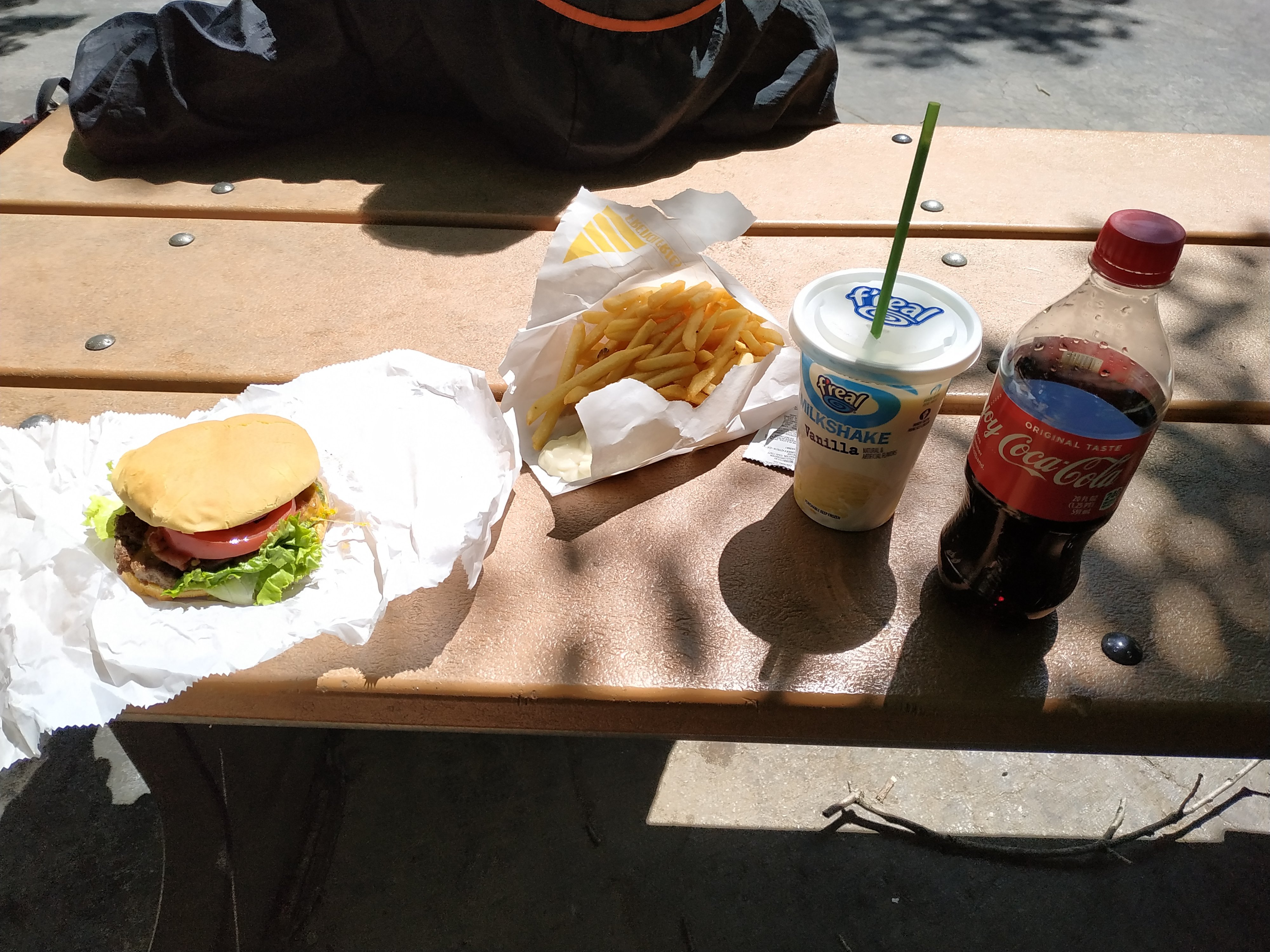 Kurz nach 11h gab es endlich mein Wunschmenü: ein Bacon-Cheeseburger, mit Fritten und einem Milchshake. Was hat das Lecker geschmeckt!