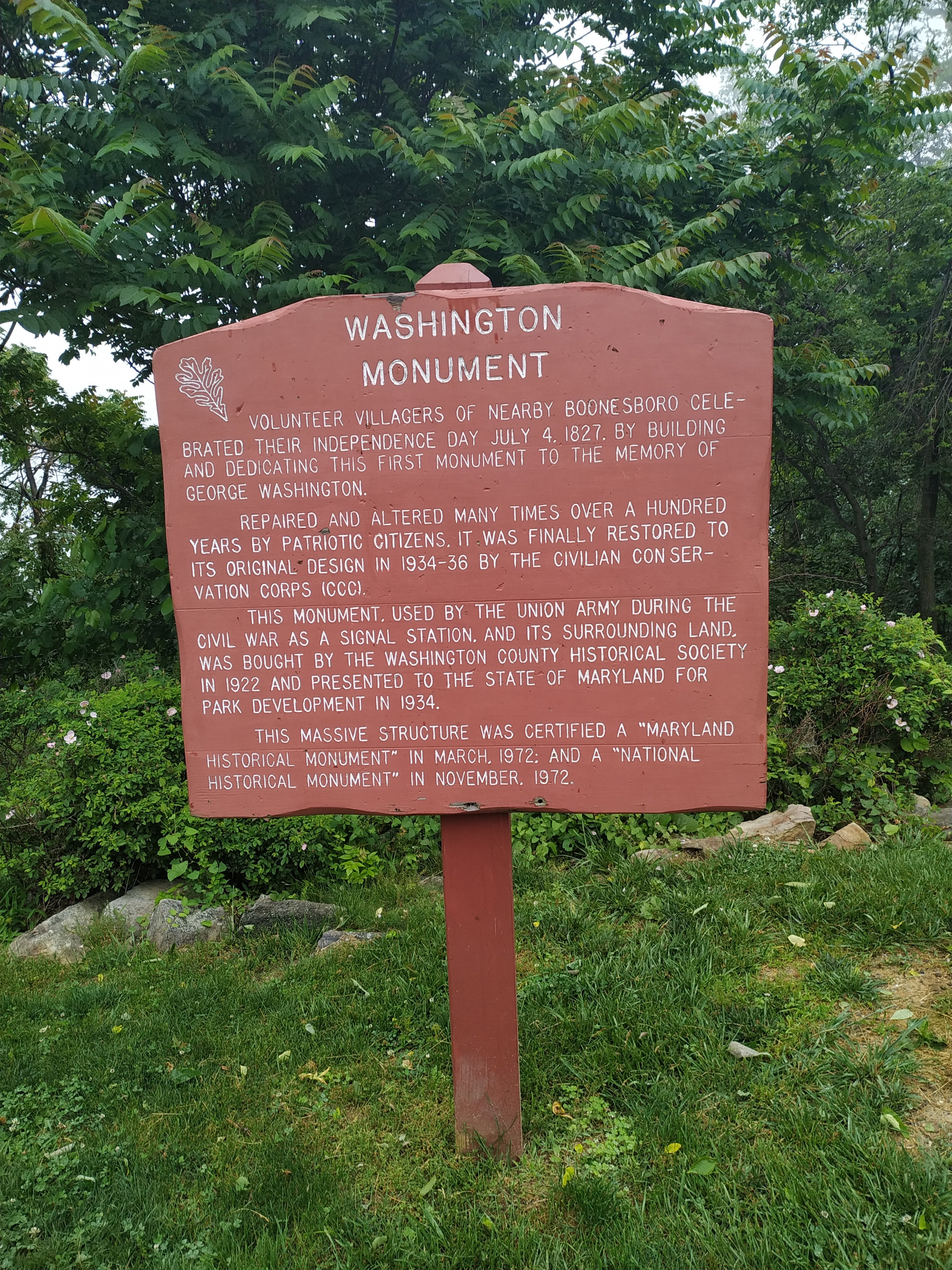 Das Washington Monument befindet sich auf dem Gipfel von Mount Vernon. Und am Weg stehen Infotafeln, die über das Leben von Washington informieren. Dieses Washington Monument hier ist übrigens älter als das in DC.