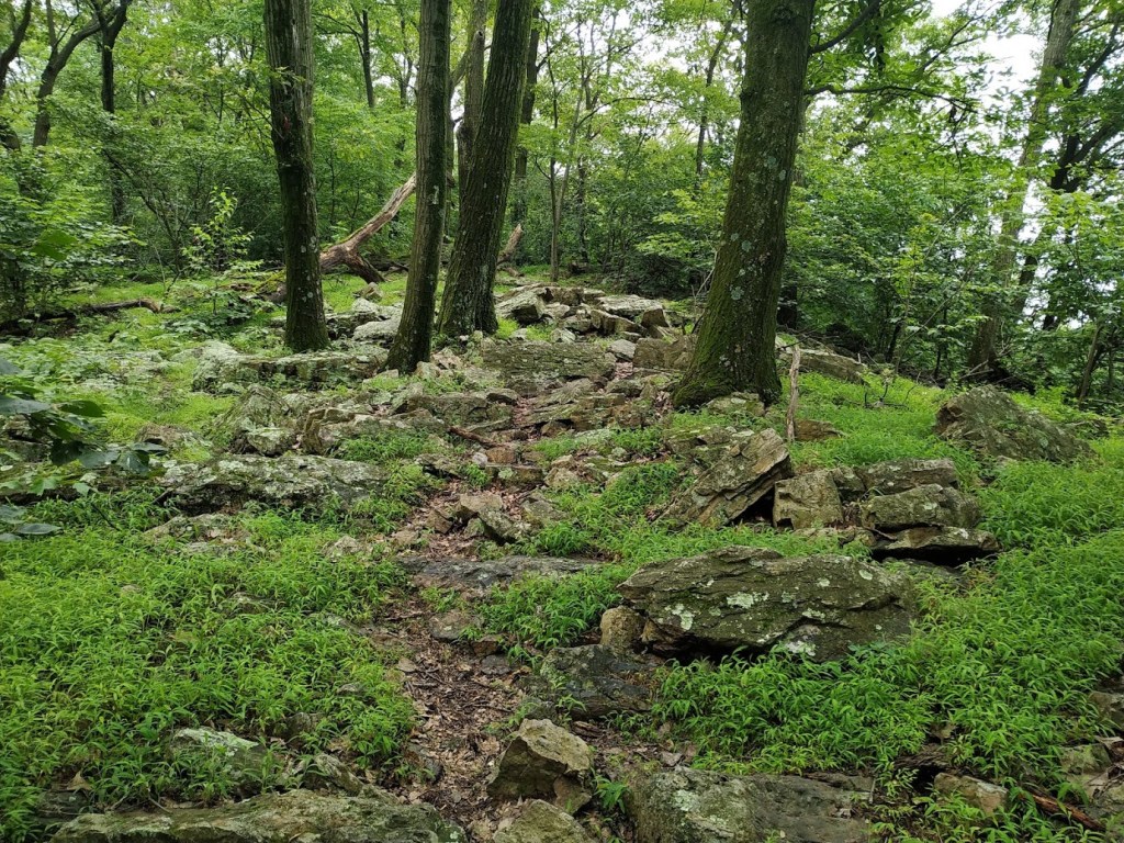 Glücklicherweise war das nur ein kurzer Aufstieg. Vor allem da es immer schwüler wurde. Und neben einer schönen Aussicht wartete oben noch etwas. Ein paar SoBos (also Wanderer von Nord nach Süd) haben davon berichtet, das sich da oben einige Schlangen tummeln. Als ich ankam, war es zum Glück „nur“ noch eine Copperhead. Eine der wenigen Giftschlangen auf dem Trail. Später habe ich dann ein Bild gesehen, auf dem zwei Copperheads und eine Klapperschlange übereinander lagen.😰