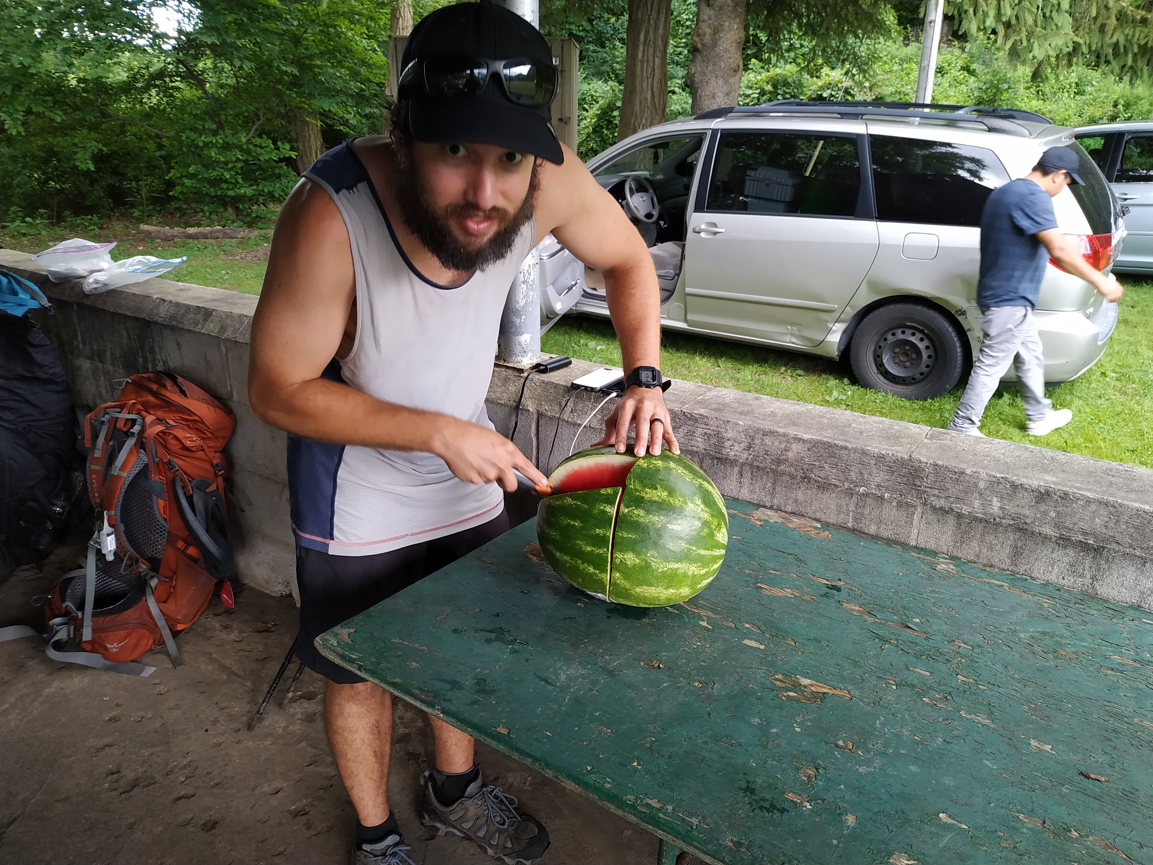 Schlussendlich gab es doch noch Trail Magic: hier fand ein Kindergeburtstag statt. Und die Eltern meinten es gut mit uns, und haben uns mit Capri Sonne, Doritos und einer Wassermelone beschenkt. Was war die lecker!