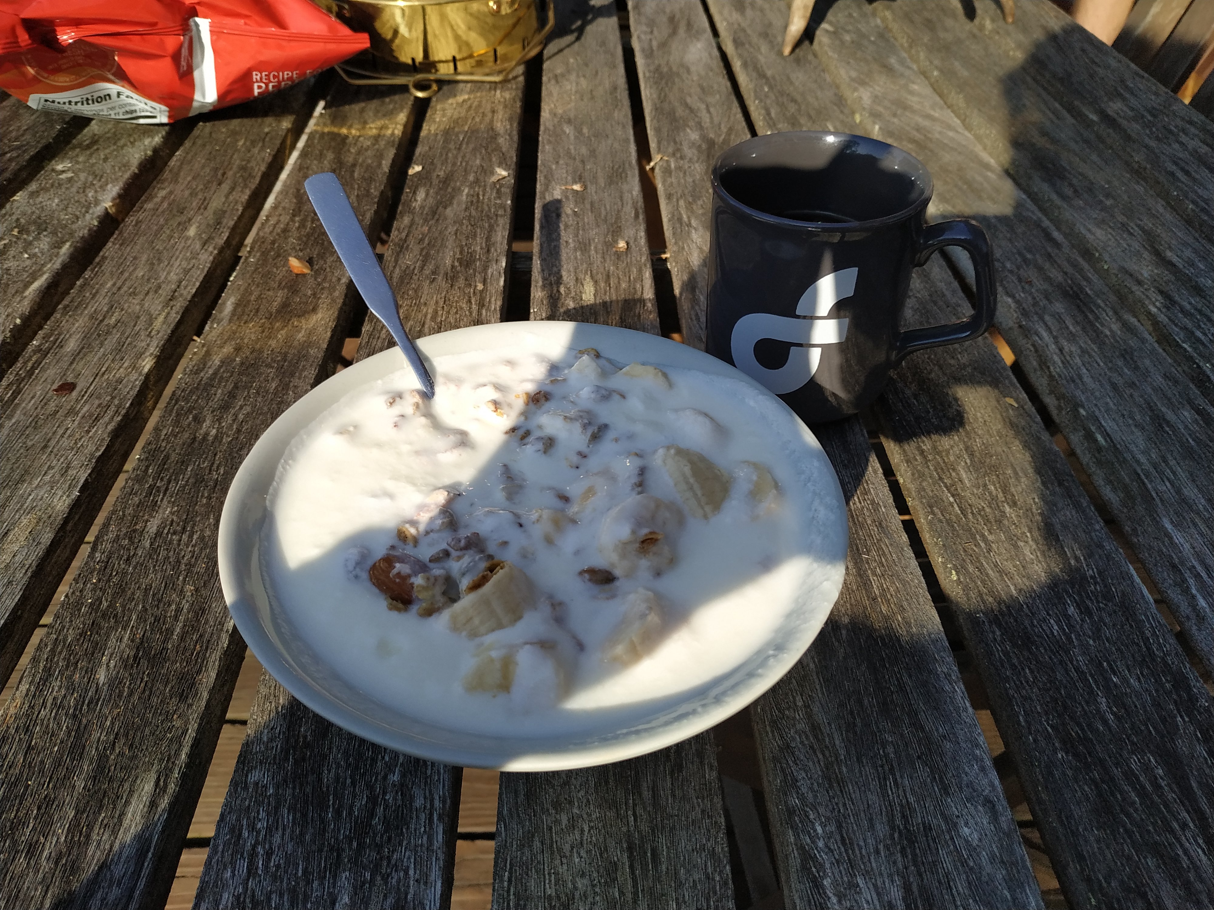 Heute morgen bin ich wunderbar erholt und ausgeschlafen wach geworden. Und das obwohl es gestern Abend ja doch spät geworden ist. Ich bin um 6:30 aufgestanden und habe meine Blogbeiträge überarbeitet und danach meinen Essenssack gepackt. Und anschließend den ganzen Rucksack, so das ich um 7:45 mit allem fertig war. Danach habe ich auf der Terrasse in der Sonne gefrühstückt. Frisches Obst mit Müsli und Joghurt mit frischem Kaffee – lecker!