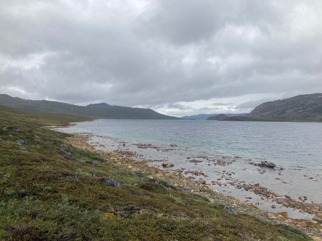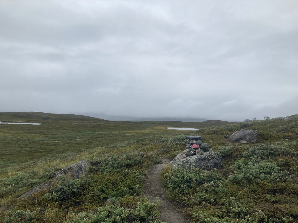 Nach der Pause führte mich der Trail entlang des Sees Immikkeertaa entlang. Vielfach hatte ich die Wahl zwischen dem Bächlein der der Trail war oder der komplett durchweichten Wiese daneben. Aber meine Füße waren ja eh schon nass. 😉 Auf und Ab, bei leichtem Nieselregen und Gegenwind. Jedesmal wenn ich eine Pause gemacht habe, habe ich danach 10 Minuten gebraucht um wieder warm zu werden. Soweit das ging. Aber schön war’s.