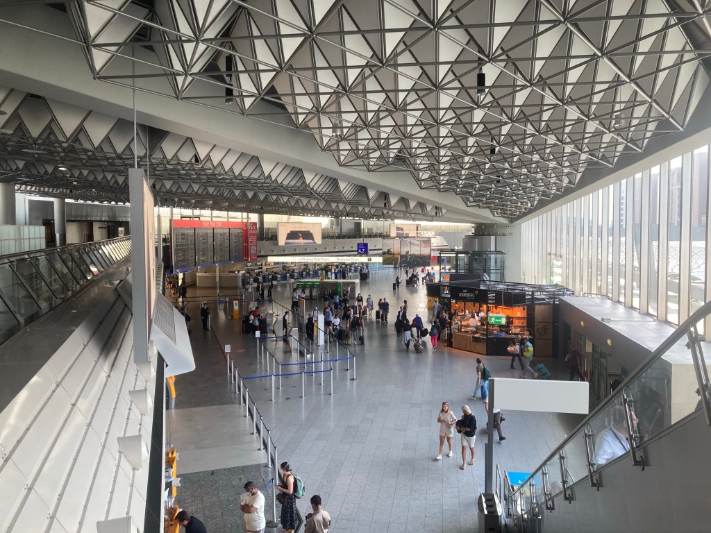 Zuerst einmal ging es zum Ohligs Bahnhof und von dort mit dem ICE nach Frankfurt. Kurz vor Köln dann der erste Stopp. Äußerst beruhigend wenn der Bahnführer sagt „wir müssen hier stoppen weil etwas passiert ist, mir sagt aber keiner warum“. Gut das ich ausreichend Zeit eingeplant hatte.