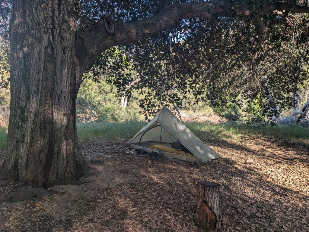 Der Zeltplatz heute ist sehr schön unter Bäumen und an einem kleinen Bach gelegen. Das tat gut, beim Wasserfiltern meine Füße zu kühlen.
