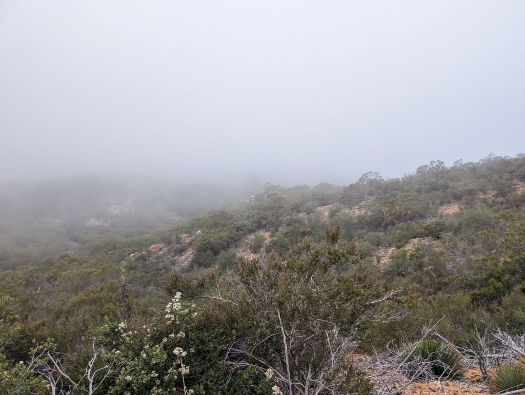 Zurück zur Wanderung. Sobald ich höher kam, wurde der Wind stärker und ich wanderte durch eine Wolke. Also Rucksack ab und Regenjacke an. Und das blieb sie auch, bis kurz vor PVC.