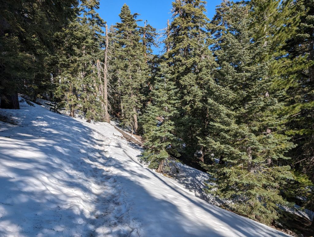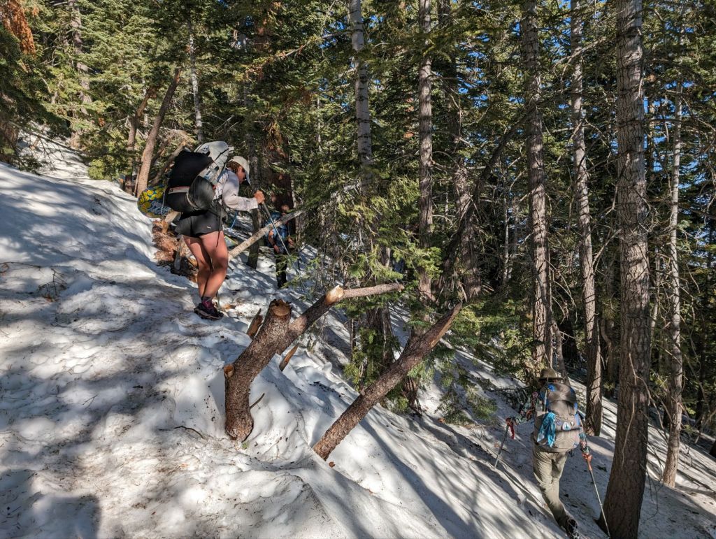 Heute standen zwei große Brocken auf dem Programm: Fuller Ridge und der Abstieg ins Tal. Gerade die Wanderung entlang Fuller Ridge ist bei vielen gefürchtet, da es seitlich steil nach unten geht. Und aktuell noch verschneit ist. Da wir früh genug unterwegs waren, war der Schnee aber noch schön fest gefroren. Wobei sich das schnell geändert hat. Es war aber deutlich weniger Postholing als gestern.