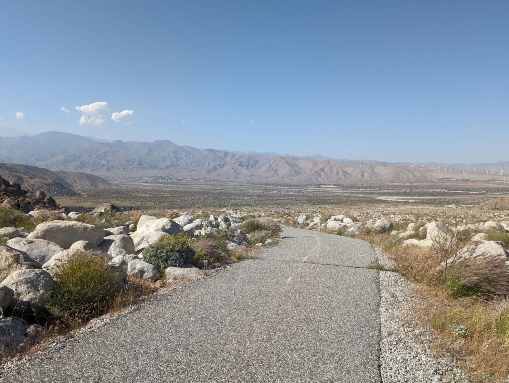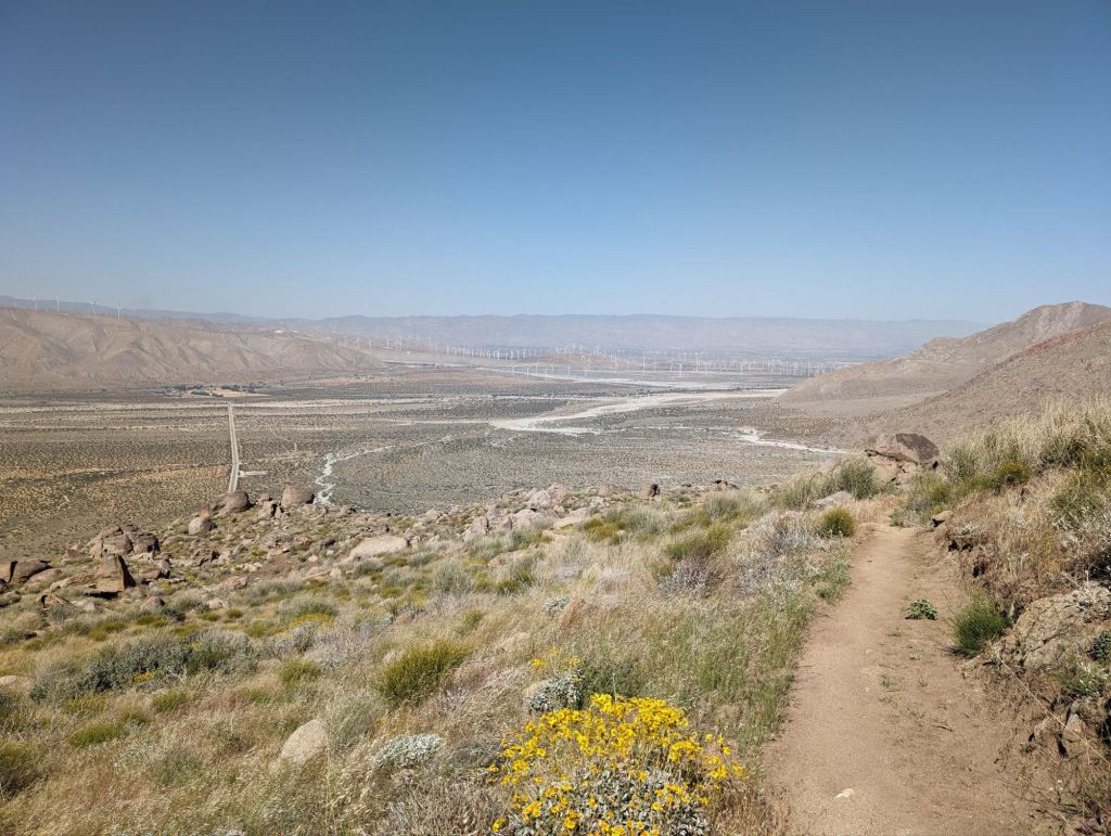 Und am Anfang habe ich mich noch sehr über die vielen Switchbacks (Serpentinen) gefreut, über die es sehr Knieschonend nach unten ging. Insgesamt war ich heute etwas über 10h unterwegs, 7 davon auf dem Weg nach unten. Durch die pralle Sonne. Und immer mit nahezu der gleichen Aussicht. Schön war es, aber irgendwann hatte ich mich doch satt gesehen. Vor allem da mein Tagesziel, die Straße I-10 den ganzen Tag sichtbar war und einfach nicht näher kommen wollte.