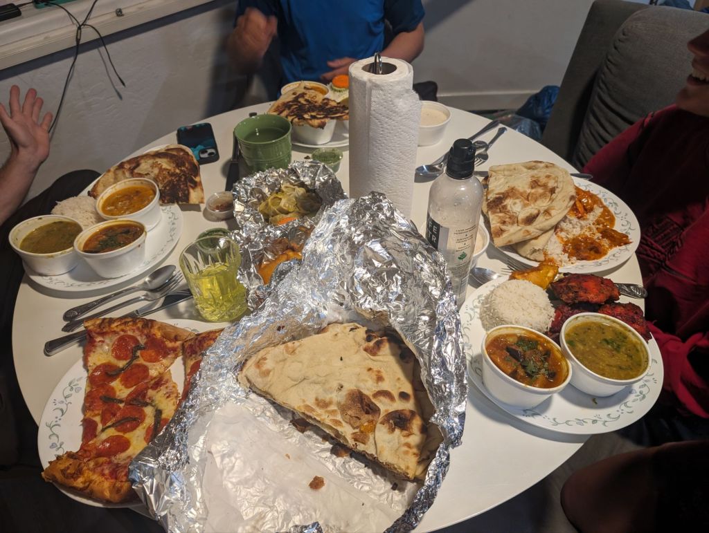 Anschließend konnten wir endlich essen bestellen. Die anderen haben Indisch bestellt. Nach meinen letzten Erfahrungen habe ich mich aber dagegen und für Pizza entschieden. Am Ende stand eine ganze Menge Essen auf dem Tisch.