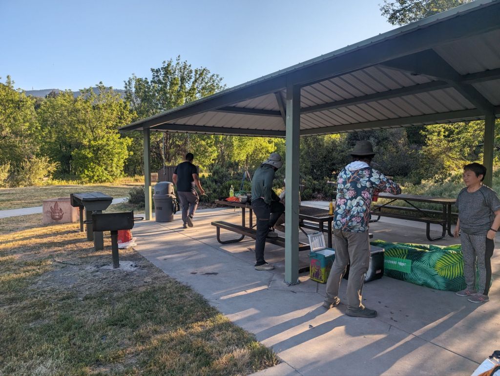Nach dieser willkommenen Abkühlung ging es durch die Sonne weiter. Zum Glück nur 2,2 Meilen. Da hatten Turmeric und Twins aus einer Plane einen Sonnenschutz gebastelt. Hier haben wir auch den Plan für den restlichen Tag ausgearbeitet. Oder es zumindest versucht. Unser Wunschziel war noch 9,7 Meilen entfernt. Und 10 hatten wir da schon auf der Uhr.