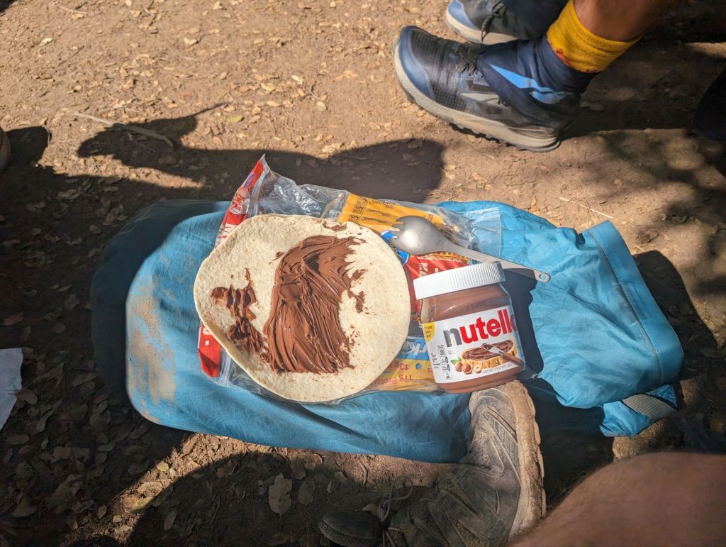 Dann war es nur noch eine schnelle Wasserpause und dann noch 0,5 Meilen bis zur Frühstückspause. Während der haben wir alle unsere Ausrüstung getrocknet. Und ich habe das erste Mal Nutella Tortillas auf dem Trail gehabt. Ausgewogene und gesunde Ernährung ist ja so wichtig. 😅