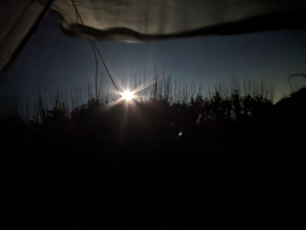 Gegen Mitternacht haben mich Windböen aufgeweckt. Und dann schien der Mond so hell, dass ich Schwierigkeiten hatte, wieder einzuschlafen. Also bin ich aufgestanden, habe beim Wasserlassen die Sterne bewundert und habe danach meine Zeltschnüre stärker abgeschnürt. Danach bin ich endlich wieder eingeschlafen.