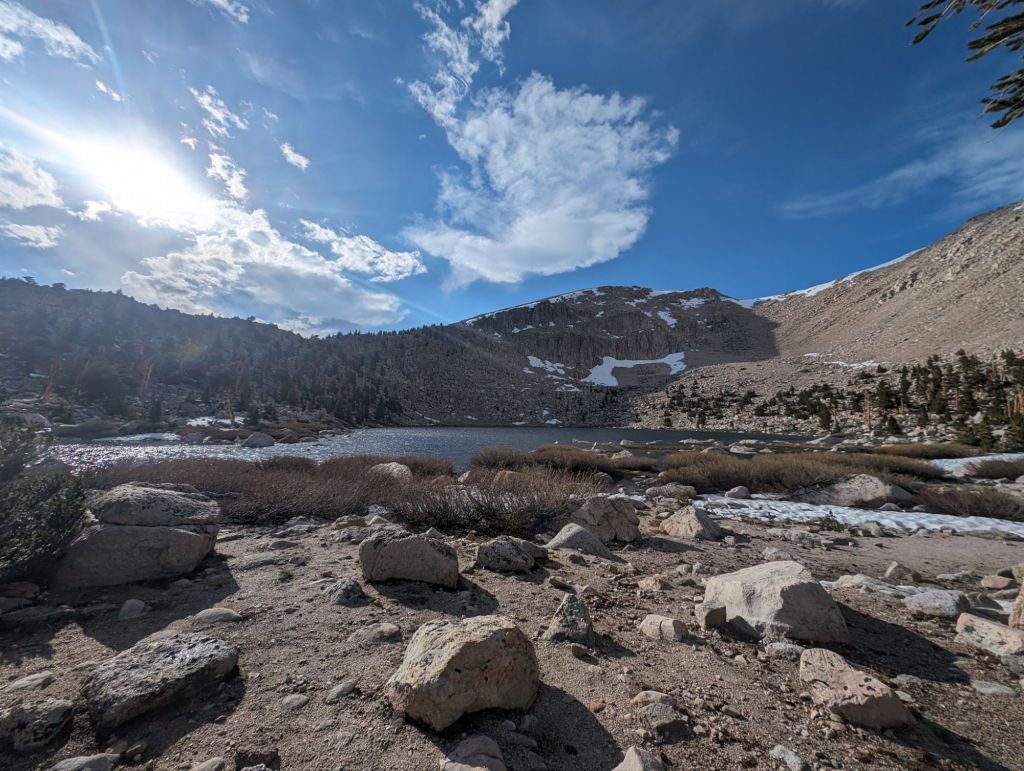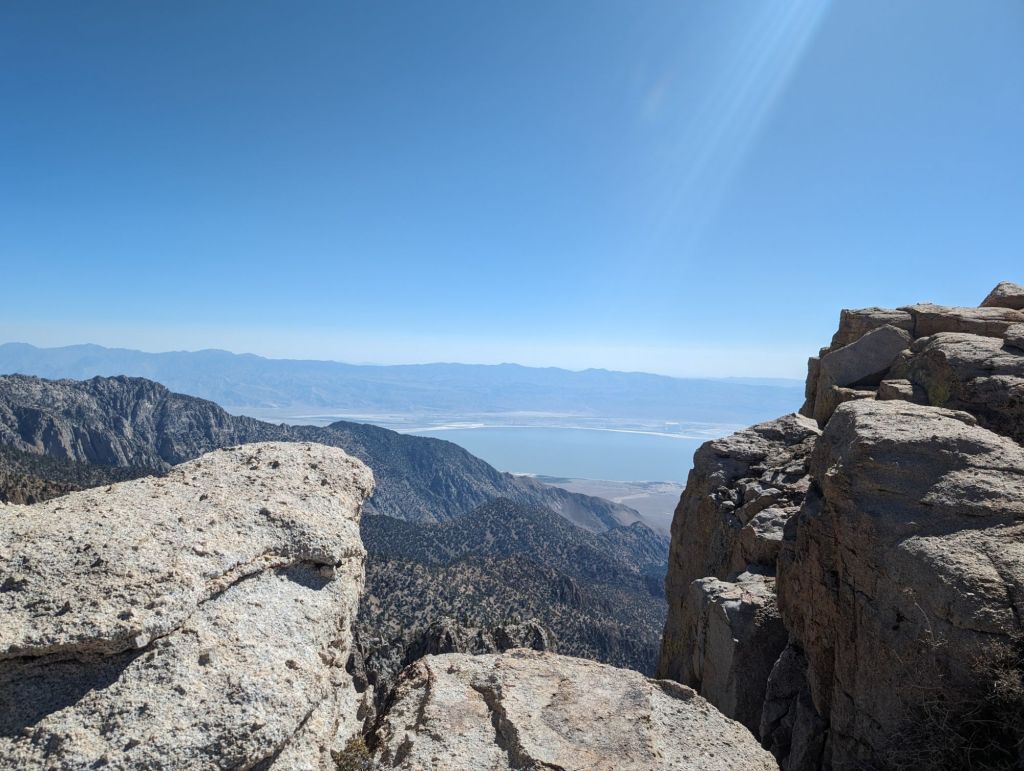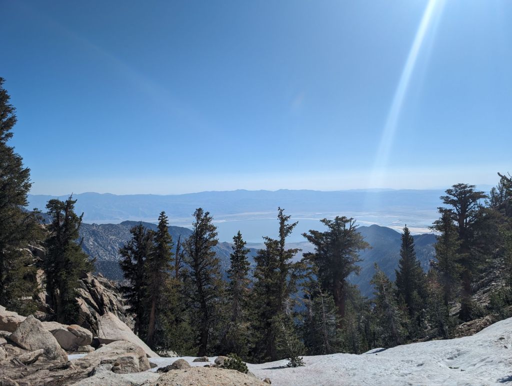 Wenig später öffnete sich die Sicht nach Osten, hinein ins Owen Valley. Üblicherweise ist der See trocken. Durch den vielen Schnee letztes und dieses Jahr war er allerdings gut gefüllt. Eine Aussicht mit Seltenheitswert. Bei der Aussicht haben wir alle eine Pause eingelegt.
