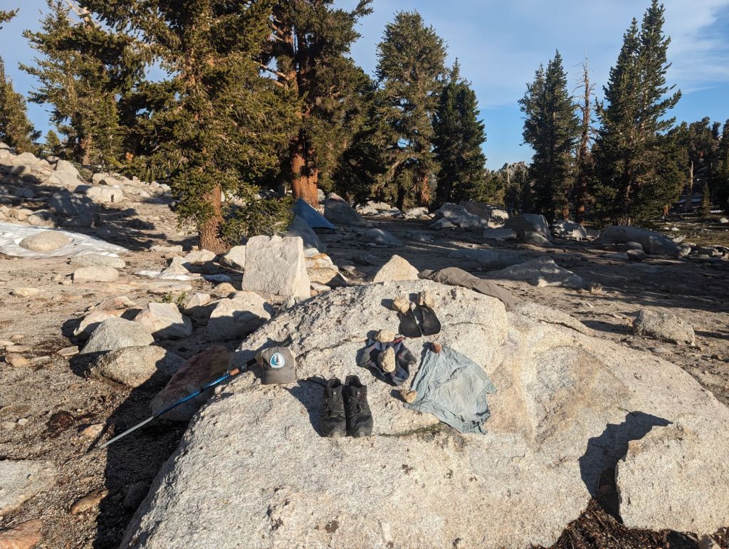 Ungefähr eine halbe Stunde vor meinem Camp kam aber die Sonne wieder raus. So konnten meine Jacke und ich unterwegs schon trocken. Und der Rest dann nach Art der Höhlenmenschen, während ich mein Zelt aufgebaut habe.