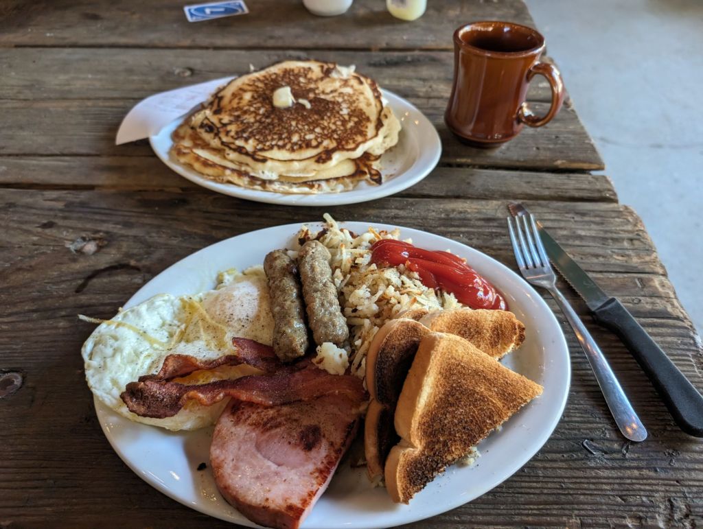 Geschlafen habe ich ganz gut in der letzten Nacht. Aber es war kalt. Wach geworden bin ich um 5h, allerdings bin ich erst um 6:30 aufgestanden. Dann habe ich sofort angefangen meine Sachen zu packen und mein Zelt abzubauen. Um 9h geht die Fähre zurück zum Trail, und ich wollte ganz in Ruhe frühstücken können. Und genau das habe ich dann auch gemacht. Die Pancakes habe ich nicht ganz geschafft.