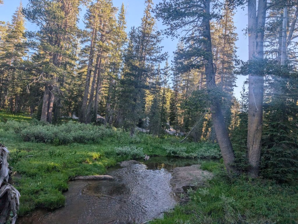 Um 12h bin ich am Mule’s Ear Creek angekommen. Was auch ziemlich nötig war, da ich bis dahin schon all mein Wasser getrunken und ziemlich durstig war. An der Kreuzung zum Creek stand ein anderer Hiker, der mich etwas seltsam angesehen hat. Er ist mir dann zum Wasser gefolgt. Es war Falk, der in Kennedy Meadows South den Trail abgebrochen hatte. Er hat die Sierras ausgelassen und will sich jetzt am Rest versuchen.