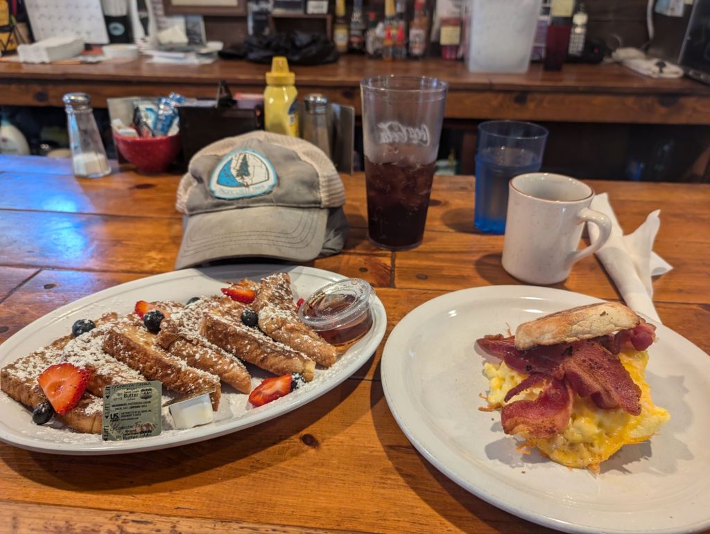 Der General Store hatte um kurz nach 8h noch geschlossen, also bin ich ins Red Moose Cafe gegangen. Eine sehr gute Entscheidung! Der Besitzer war super freundlich und das Essen mega lecker. Hier habe ich auch Moon, BJ und Marie getroffen und habe mit Ihnen an der Bar gesessen.