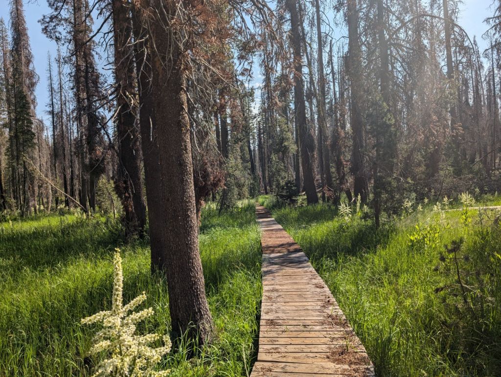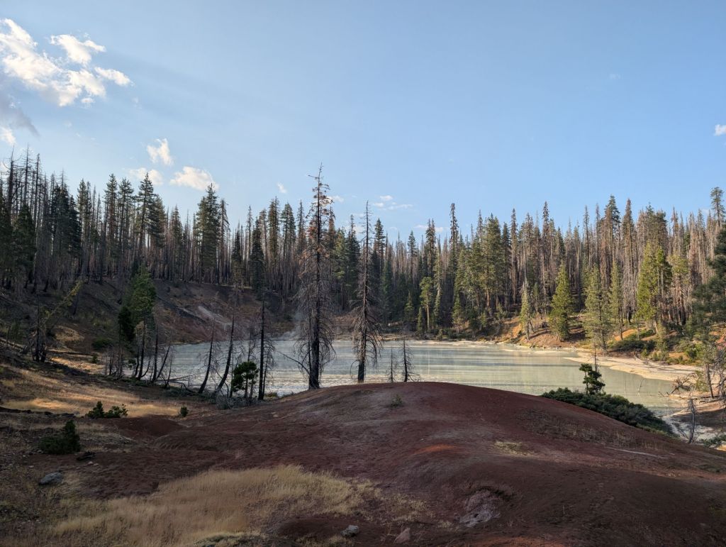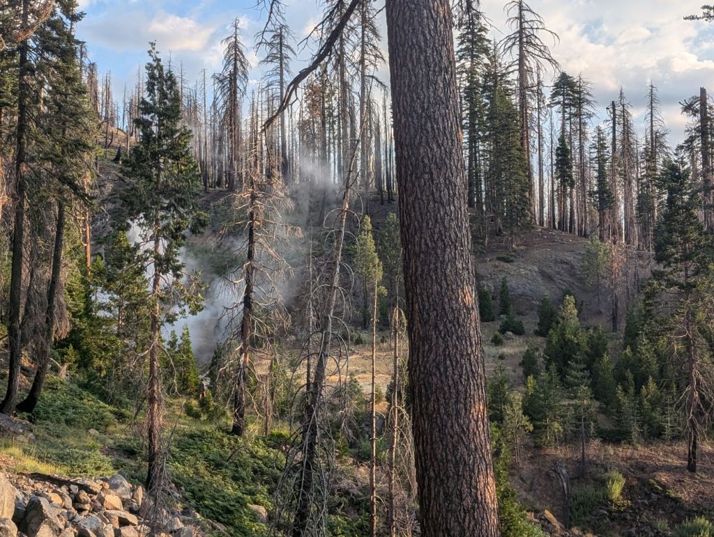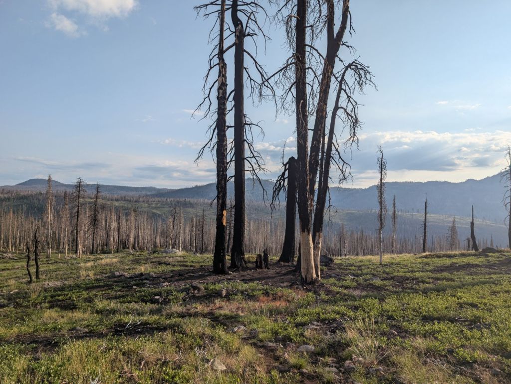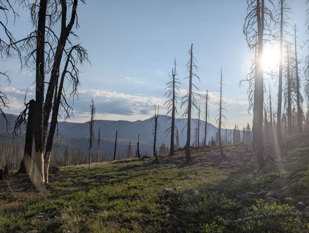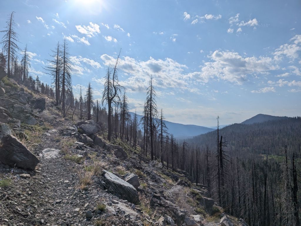 Die nächsten Meilen waren viel vom gleichen: flach oder leicht abwärts, durch verbrannte Wälder und ohne Schatten. Unterwegs konnte ich Lösch-Hubschrauber beobachten, die ein Feuer gelöscht haben. Vermutlich durch einen Blitzschlag gestern verursacht.