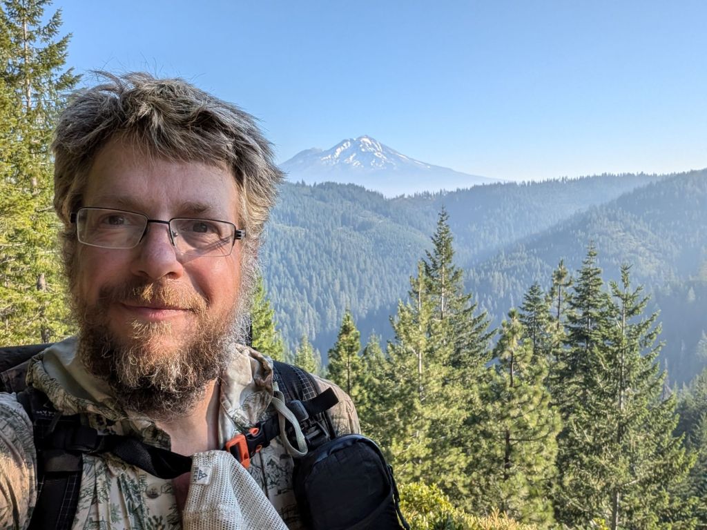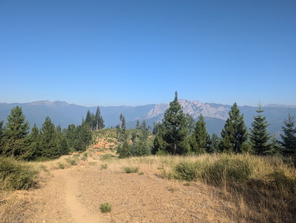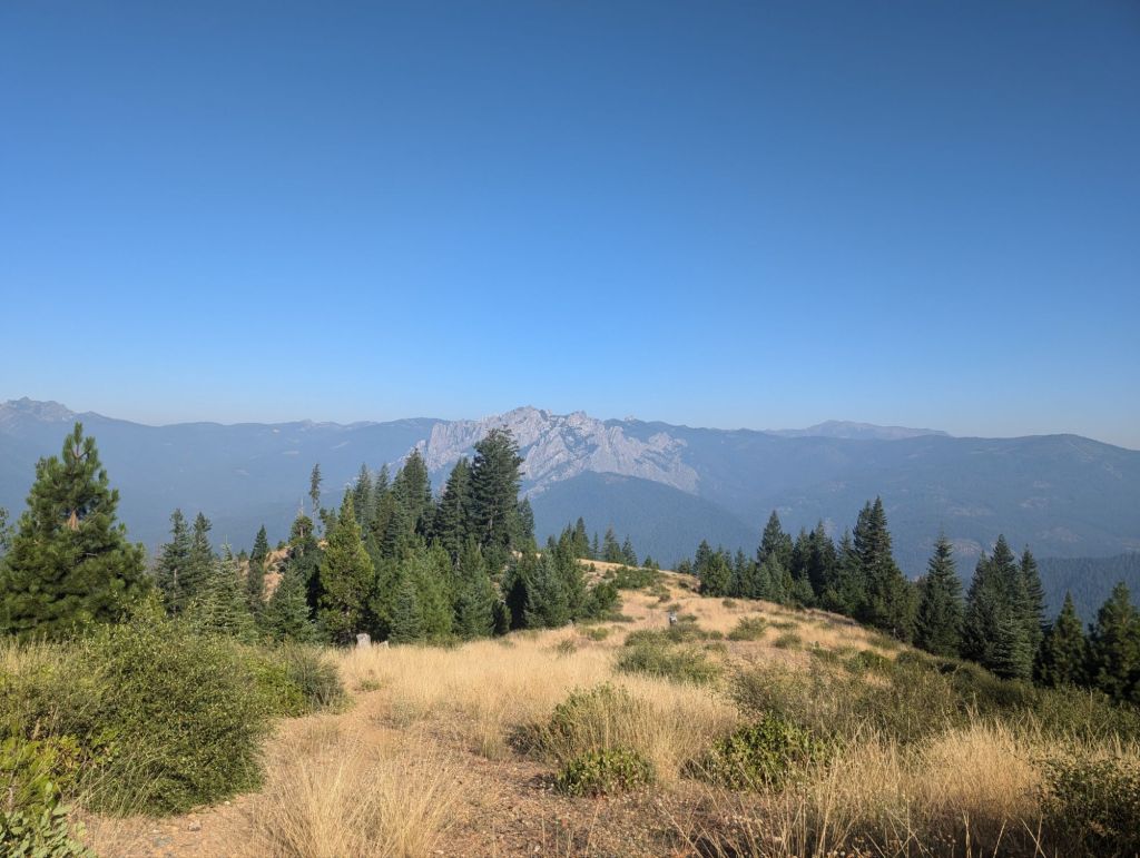 Nach etwas über anderthalb Stunden war der größte Teil des Anstiegs geschafft und der Trail öffnete sich. Und der Ausblick auf Mount Shasta war echt gigantisch. Die Sonne durch die Rauchschwaden hat noch zusätzliche Dramatik hinzugefügt.