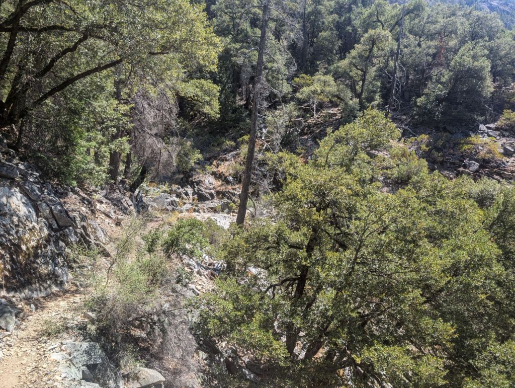 Danach ging es aufwärts. Und wie! Nachdem ich bis hier schon 700 Höhenmeter überwunden hatte kamen jetzt auf 4,9 Meilen nochmal etwas über 700 dazu. Und auf Grund der Uhrzeit wurde es auch wieder richtig heiß. Ich habe so geschwitzt, dass ich getropft habe.