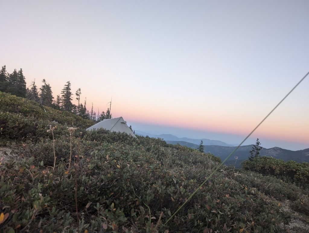 Um 18:20 waren wir an der Abzweigung zu einer Quelle. Die Zeltplätze sind alle ziemlich exponiert und liegen am Kamm. Das heißt, super Aussicht und keine Mücken. Aber auch ziemlich starker Wind. Entsprechend gut und stramm habe ich mein Zelt heute abgespannt.