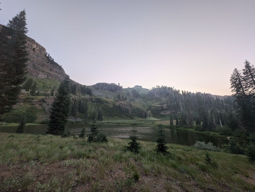 Um 19:10 war ich an meiner Campsite. Die liegt heute an einem kleinen See. Und alle guten Plätze sind trotzdem geneigt. Außerdem ist es ziemlich windig und sogar etwas kühl. Beim Abendessen habe ich sogar zum Windschutz meine Daunenjacke getragen.