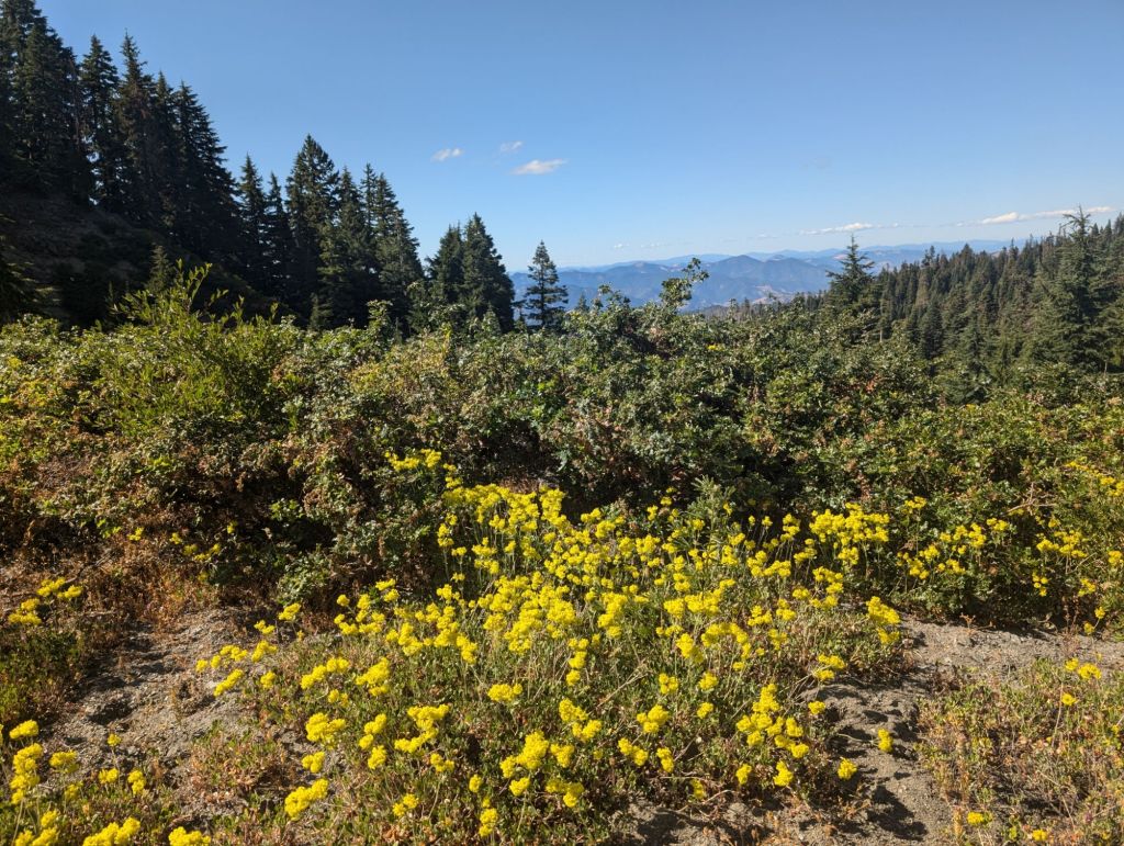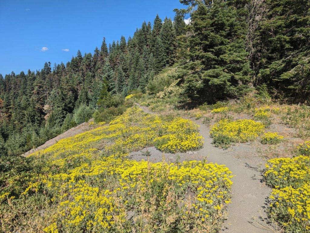 Danach verlief der Trail weiter auf und ab, aber in deutlich besseren Zustand. Allerdings habe ich doch gemerkt, dass ich ziemlich fertig war. Daran konnten auch all die schönen und blühenden Wildblumen nichts ändern.