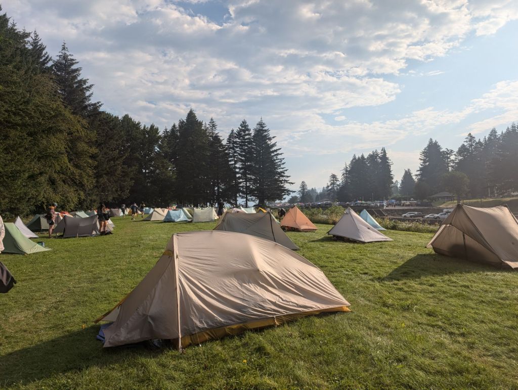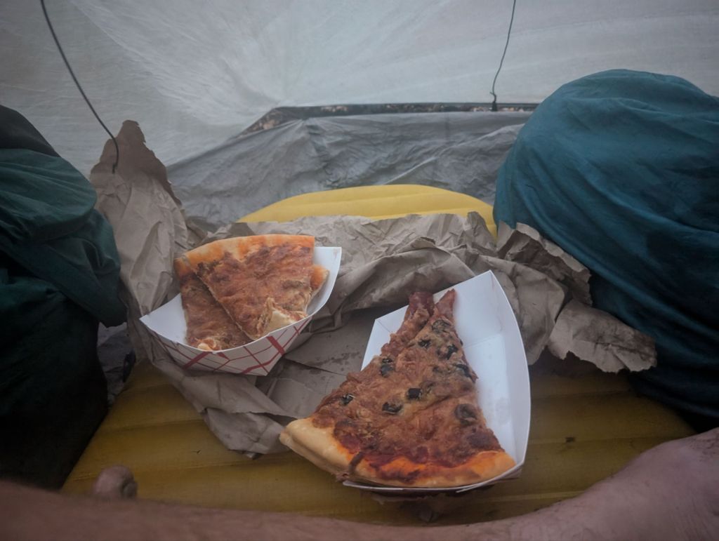 Nachdem ich mich etwas gestreckt hatte, bin ich Richtung Trail Days gegangen. Da habe ich Bagel und einige andere getroffen. Und wir hatten alle das gleiche Ziel: Frühstück. Das Schild „Pancake Breakfast“ war entsprechend verlockend. 😅 Für 10$ gab es All you can eat Pancakes, Wassermelone, Würstchen, Kaffee und Orangensaft. Mehr als fair und ziemlich gut.