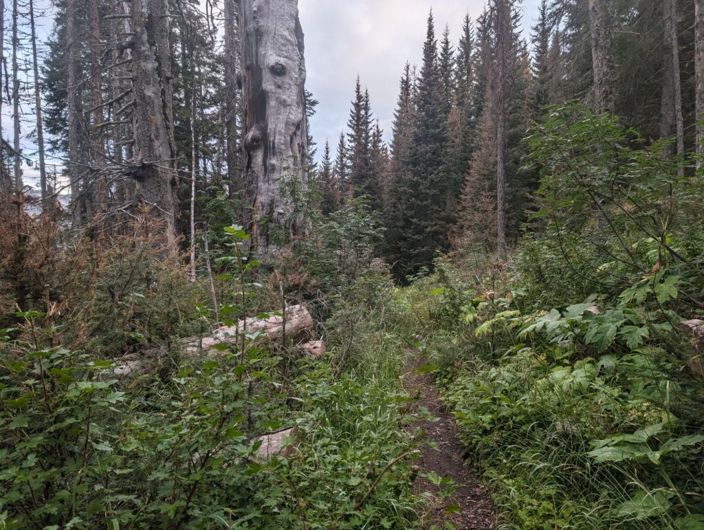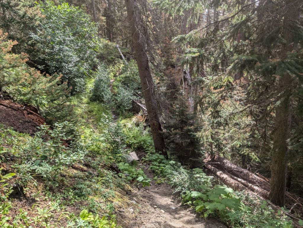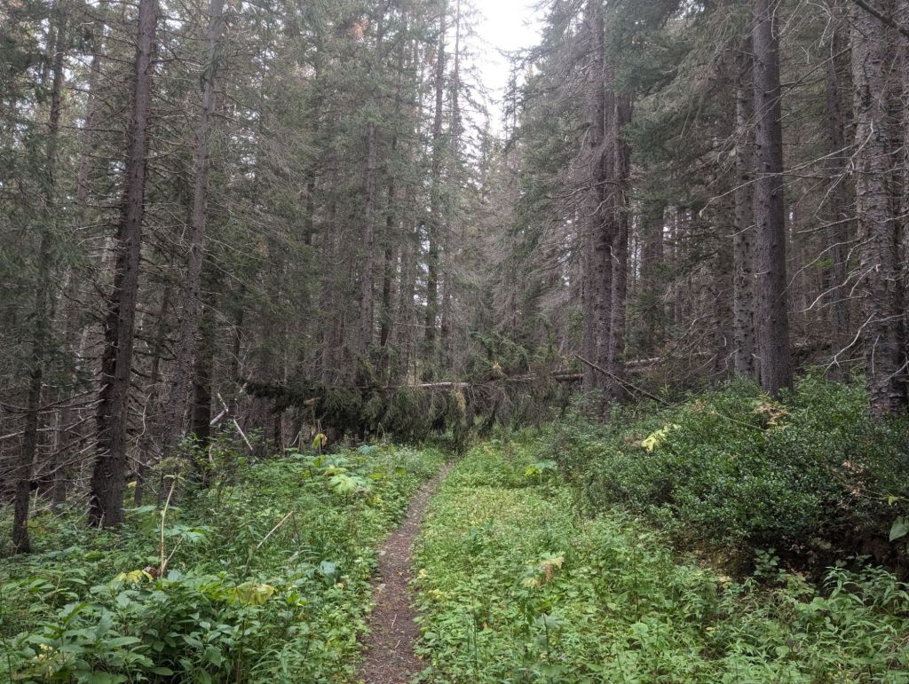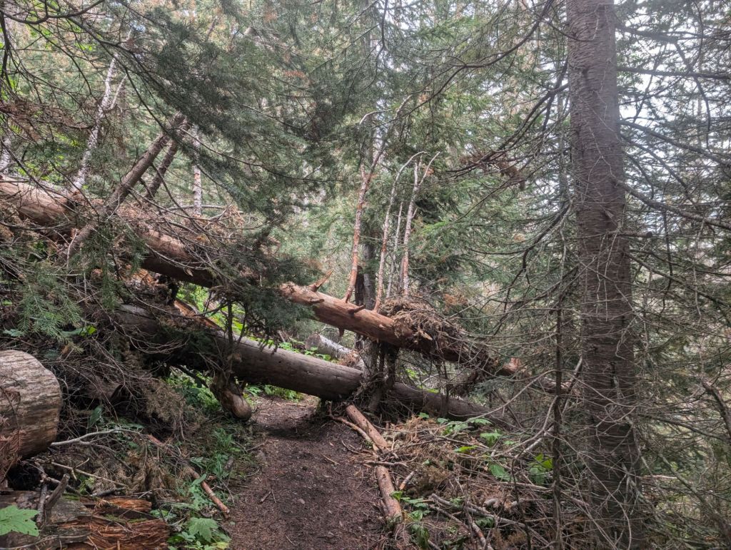 Und die ersten drei Kilometer waren eher ungepflegt. Überwachsen, viele Blow Downs und teilweise ausgespült.